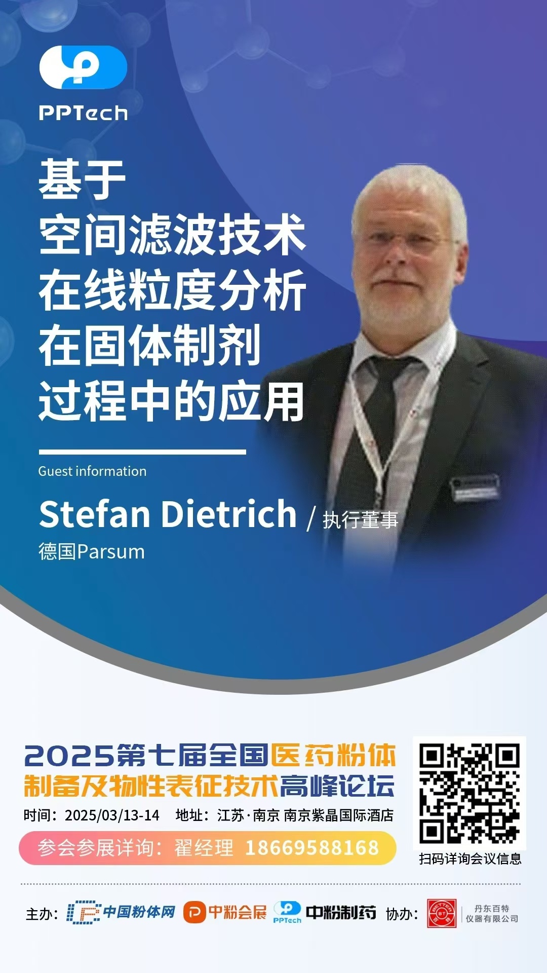 以“从粉体技术,论制药工艺”为主题,2025年3月13-14日中国粉体网将在江苏南京紫晶国际酒店举办“2025第七届全国医药粉体制备及物性表征技术高峰论坛”。届时来自德国Parsum公司的执行董事Stefan Dietrich博士为大家带来《基于空间滤波技术在线粒度分析在固体制剂过程中的应用》的主题报告。报告主讲人将用实际数据,展示在线粒度分析在各种造粒设备上应用的重要性和先进性。尤其是在一步制粒或全自动连续造粒上,在线粒度分析的重要性。