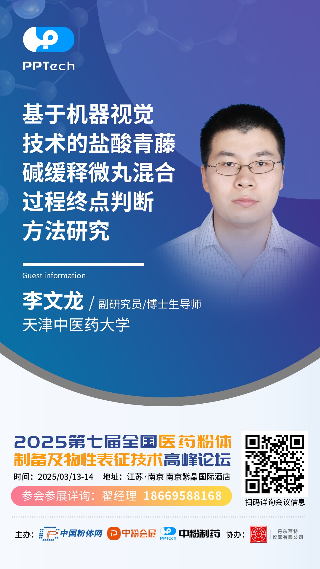 以“从粉体技术,论制药工艺”为主题,2025年3月13-14日中国粉体网将在江苏南京紫晶国际酒店举办“2025第七届全国医药粉体制备及物性表征技术高峰论坛”。届时来自天津中医药大学的李文龙副研究员为大家带来《基于机器视觉技术的盐酸青藤碱缓释微丸混合过程终点判断方法研究》的主题报告。报告主讲人将分享研究心得,研究制备了盐酸青藤碱的4小时胃溶缓释微丸和8小时肠溶缓释微丸,考察了其溶出稳定性、物理外观和化学稳定性,并制备了辅料颗粒。随后对两种微丸赋色,以混料罐转速、填料质量、微丸比例、微丸与辅料比例和硬脂酸镁用量为因素进行试验设计。在混合过程中,利用机器视觉技术采集不同层位的微丸分布图像,并开发图像分析算法,实现对两种微丸空间分布的数字化表征。最终,该算法与传统计数法对比,成功实现了缓释微丸混合状态的表征及混合终点的准确判断。