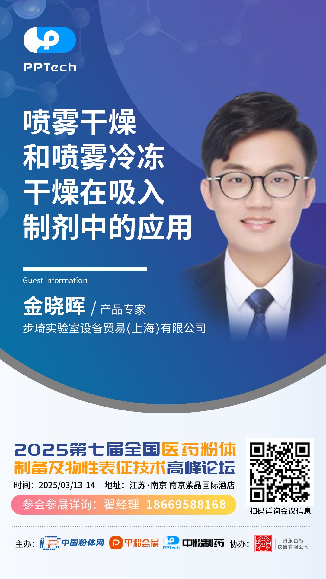 以“从粉体技术,论制药工艺”为主题,2025年3月13-14日中国粉体网将在江苏南京紫晶国际酒店举办“2025第七届全国医药粉体制备及物性表征技术高峰论坛”。届时来自瑞士BUCHI公司产品专家金晓晖为大家带来《喷雾干燥和喷雾冷冻干燥在吸入制剂中的应用》的主题报告。本次报告将系统介绍、分析比较喷雾干燥和喷雾冷冻干燥这两种方法在吸入制剂中的应用。