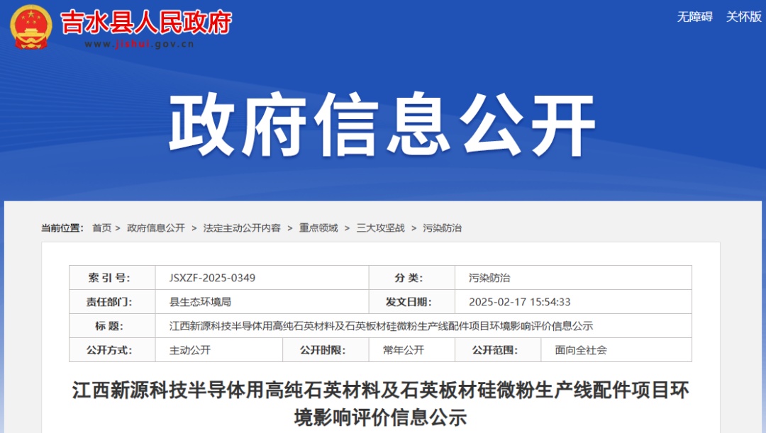 近日,吉水县人民政府对江西新源科技半导体用高纯石英材料及石英板材硅微粉生产线配件项目环境影响报告表受理情况进行了公示。该项目产品方案为年加工石英法兰10万件、石英玻璃器件36万件、高纯石英砂1.5万吨、硅微粉和板材砂45万吨。