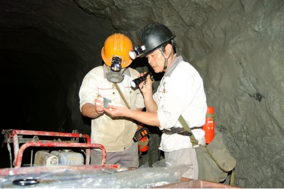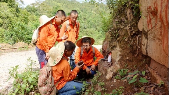图为地质技术员在查看矿体露头