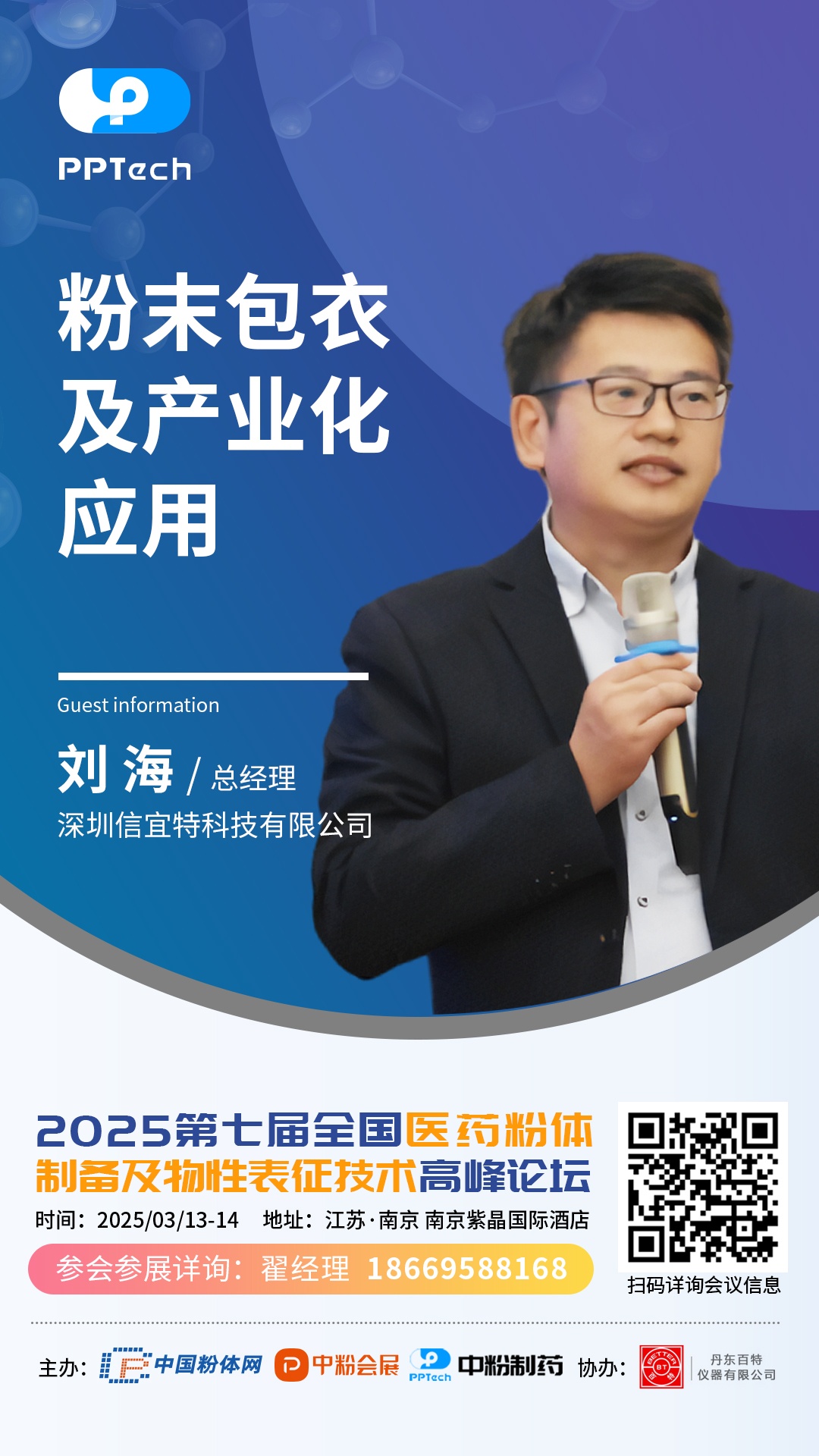 以“从粉体技术,论制药工艺”为主题,2025年3月13-14日中国粉体网将在江苏南京紫晶国际酒店举办“2025第七届全国医药粉体制备及物性表征技术高峰论坛”。届时来自深圳信宜特科技有限公司的刘海总经理将为大家带来《粉末包衣及产业化应用》的主题报告。报告主讲人基于多年制药工艺与技术的经验,通过以往的成功案例,同时结合公司的设备优势给大家带来一站式解决方案。