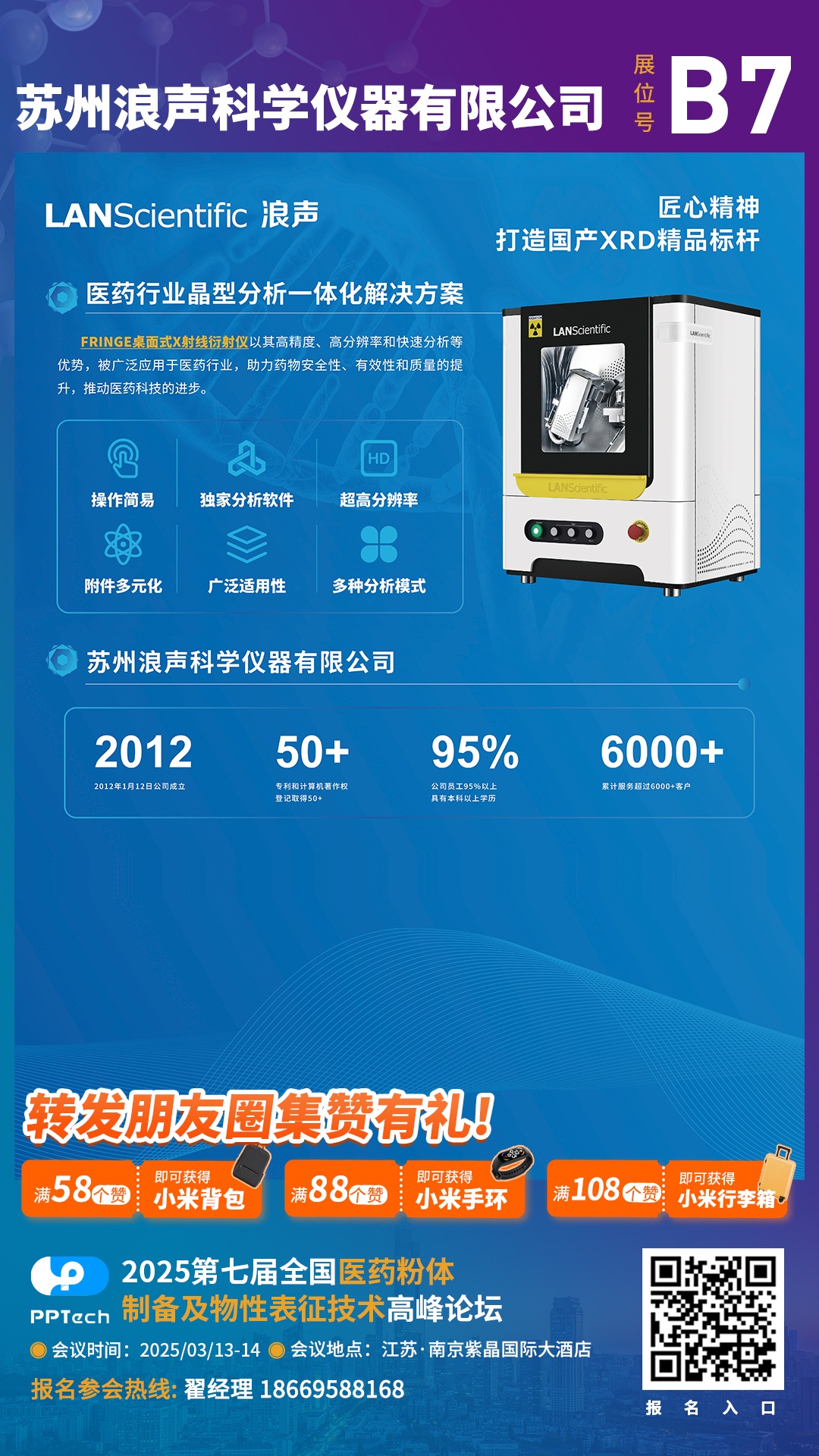 从第七届全国医药粉体制备及物性表征技术高峰论坛组委会获悉,本届会议将于2025年3月13-14日在南京举办。苏州浪声科学仪器有限公司作为参展单位邀请您共同出席。