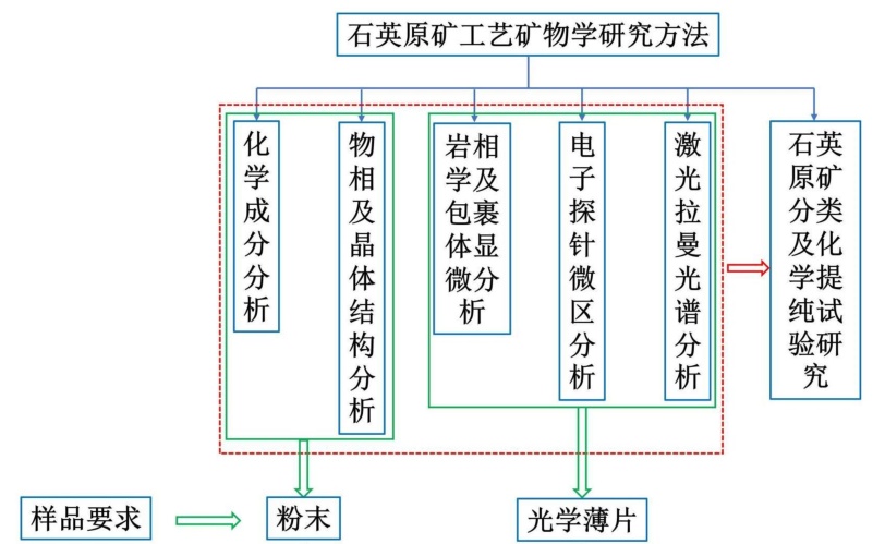 高纯石英原料的质量及加工难度受矿物包裹体及流体包裹体的影响,因此需进一步对原料中包裹体的数量、大小、分布状态、成分组成、形态形貌等特征进行研究。进行包裹体分析可以借助偏光显微镜、冷热台、傅里叶变换红外光谱仪、激光拉曼光谱仪等设备。