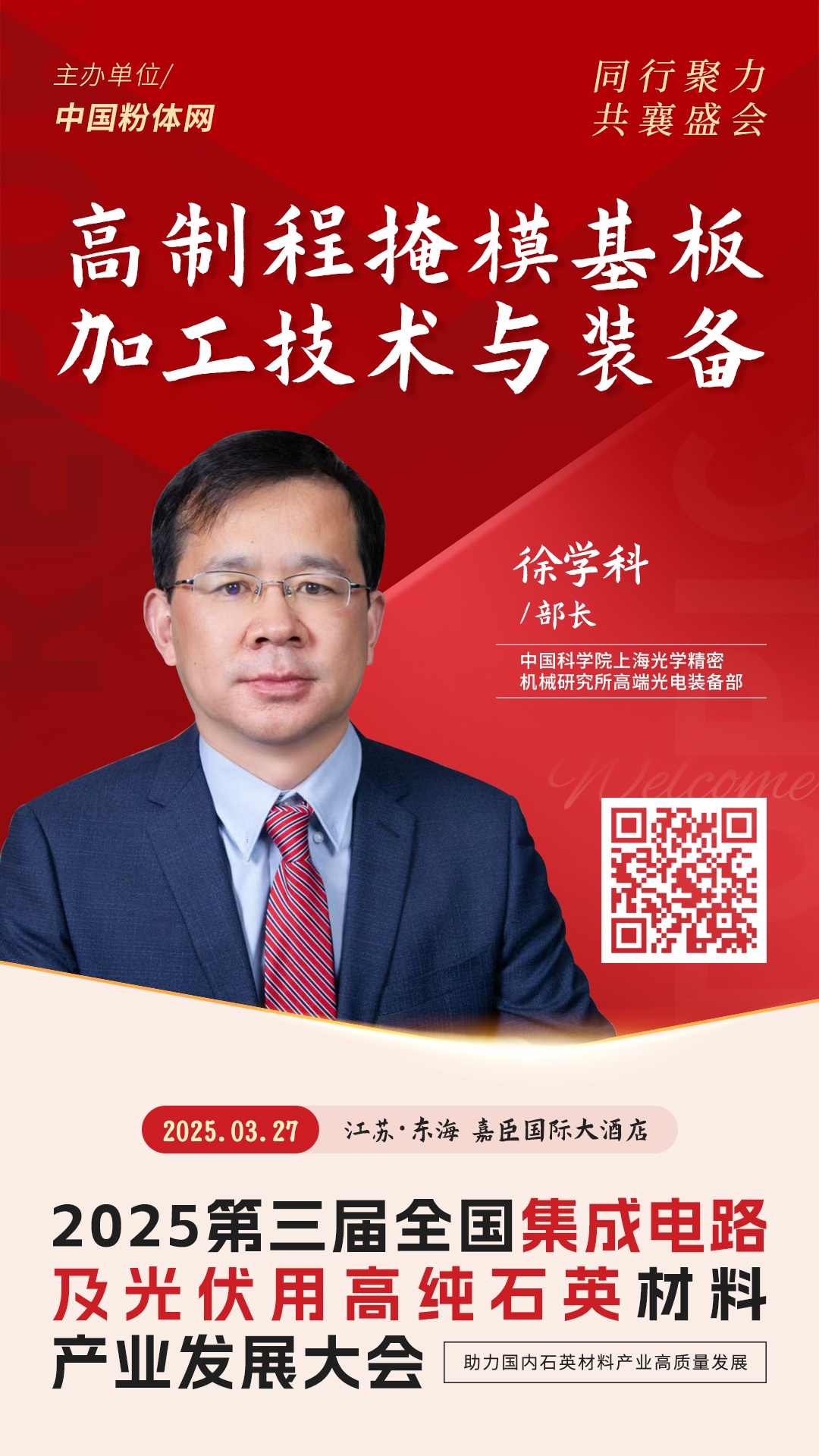 2025年3月27日,由中国粉体网主办的“2025第三届集成电路及光伏用高纯石英材料产业发展大会”将在江苏东海召开,届时来自中国科学院上海光学精密机械研究所高端光电装备部的徐学科部长,将做题为《高制程掩模基板加工技术与装备》的报告。