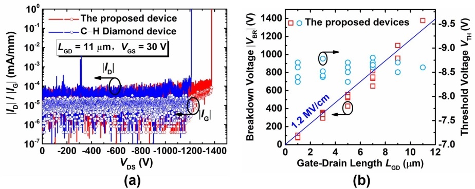 实验结果显示,该新型金刚石功率器件实现了-8.6 V的高阈值电压和-1376 V的关态击穿电压,击穿场强达到1.2 MV/cm,性能指标远超国内外同类器件水平。这一成果不仅是国际上首次报道硅终端沟道金刚石器件的高压特性,更为未来高压大功率系统的应用奠定了坚实基础。