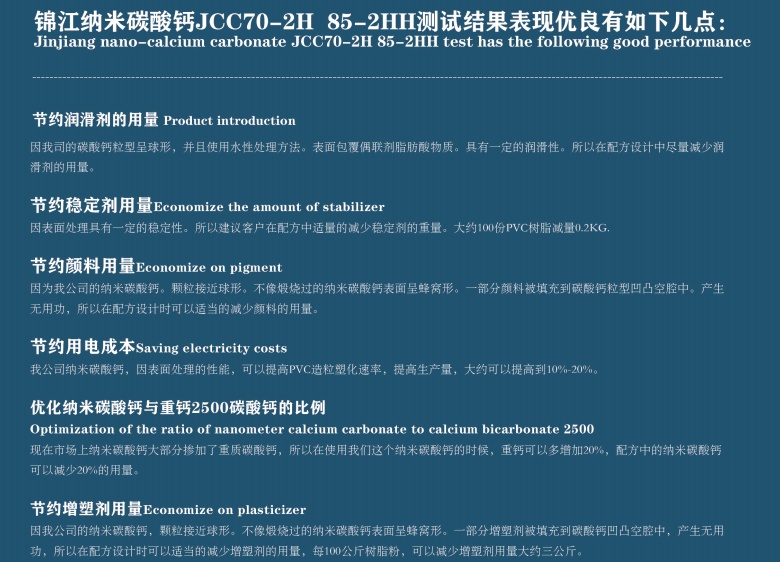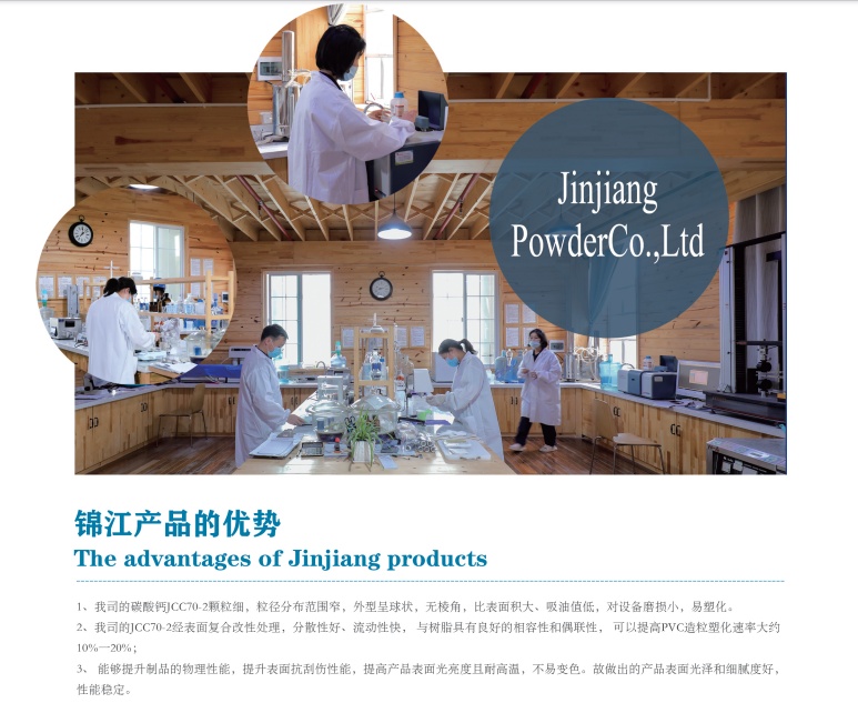 与橡胶、塑料的分子间亲和力强、填充量比普通碳酸钙可多填充 29-5%,综合生产成本明显降低。吸油值低、白度高、延伸度高,而且其特有的超强金属剥离性和显著的润滑效果,还能提高制品表面的光亮度,磨损和抗冲击强度。减小对加工机械的磨耗度,改善产品加工工艺,提高制品性能,具有较好的补强作用。该产品广泛应用于橡胶、塑料、塑钢门窗、PVC电缆料、压延膜、管材、轮胎、鞋底、聚乙烯吹膜、密封胶条、玻璃钢制品、电缆包装布、造纸、建材、油里、日用化工、纺织等行业,提高品质,降低生产成本,具有经济效益。