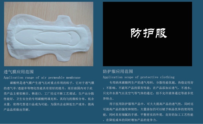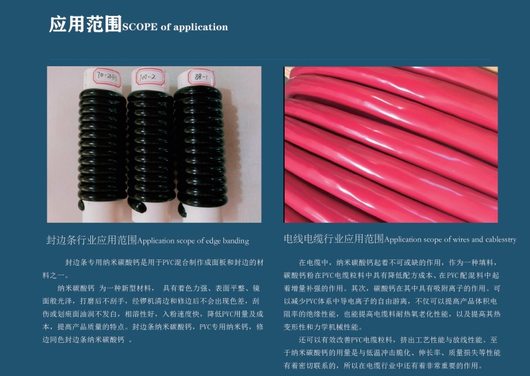 广泛应用于橡胶、塑料、塑钢门窗、PVC电缆料、高级涂料、管材、轮胎、鞋底、聚乙烯吹膜、封胶条、玻璃钢制品、造纸、建材、油墨、日用化工、纺织、饲料、食品添加剂等行业。