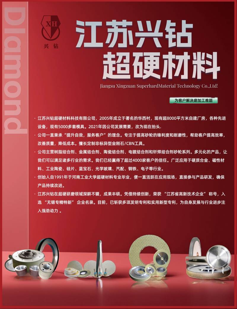江苏兴钻超硬材料科技公司位于无锡华西村,建筑面超过8000平方米。公司有三十年生产经验,致力于帮助客户解决磨加工难题,提高加工效率,降低生产成本。迄今已经赢得超过三千位客户的信任!