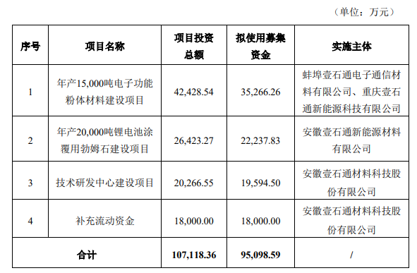 2022年,壹石通募集资金总额不超过95,098.59万元用于年产15,000吨电子功能粉体材料建设项目、年产20,000吨锂电池涂覆用勃姆石建设项目、技术研发中心建设项目以及补充流动资金项目。