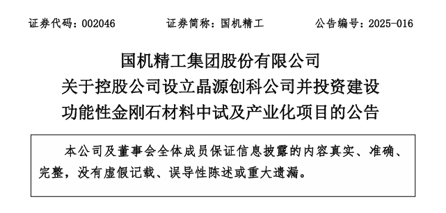 中国粉体网讯 3月25日,国机精工(002046.SZ)发布公告,旗下国机金刚石(河南)有限公司将投资3.8亿元,在新疆哈密市设立国机金刚石晶源创科(新疆)有限公司,建设功能性金刚石材料中试及产业化生产线。