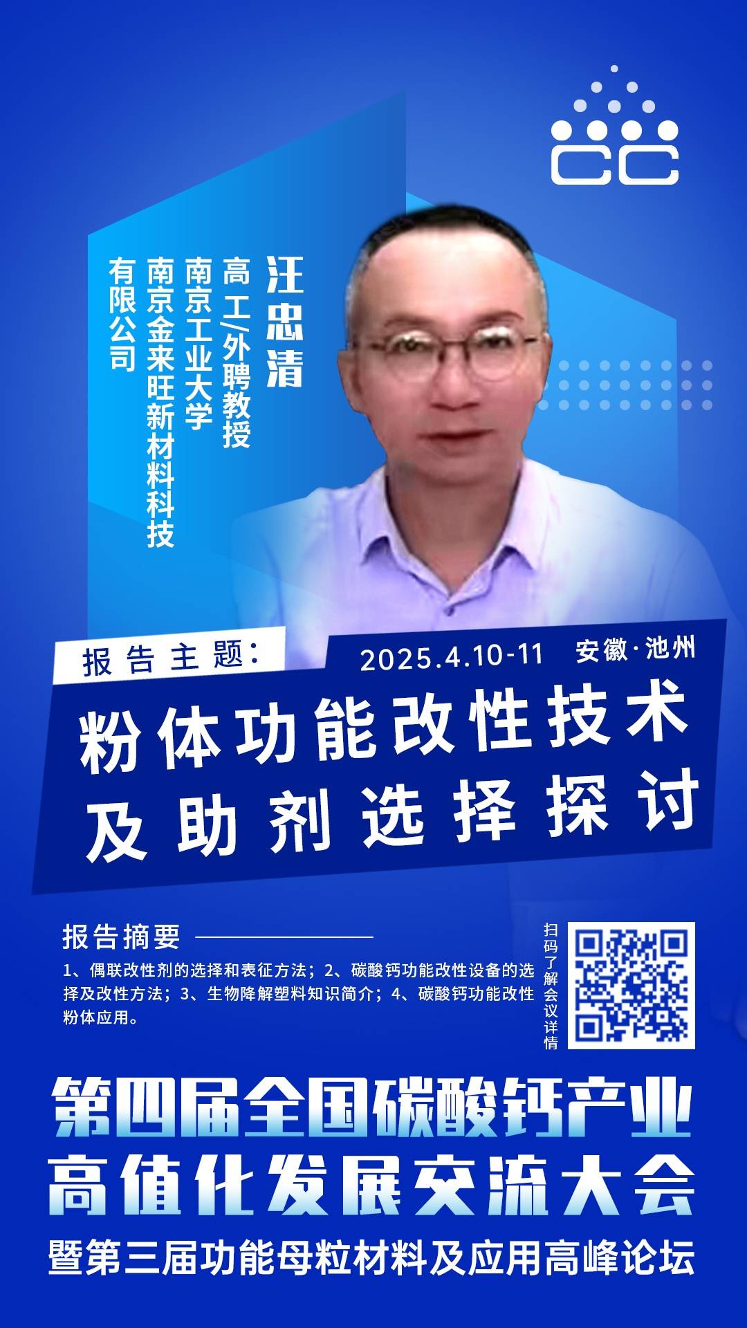 2025年4月10-11日,由中国粉体网主办的第四届全国碳酸钙产业高值化发展交流大会将在安徽·池州举行,届时南京金来旺新材料有限公司汪忠清教授将在大会上作《粉体功能改性技术及助剂选择探讨》主题报告,分享粉体表面功能改性方法、偶联改性剂、改性产品的表征与应用等内容。