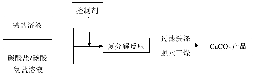 复分解法可通过控制反应物的浓度、温度及生成物碳酸钙的过饱和度,加入适当的添加剂等制取球形的粒径小于0.1μm、比表面积很大、溶解性很好的无定形碳酸钙产品,其纯度高、白度好。