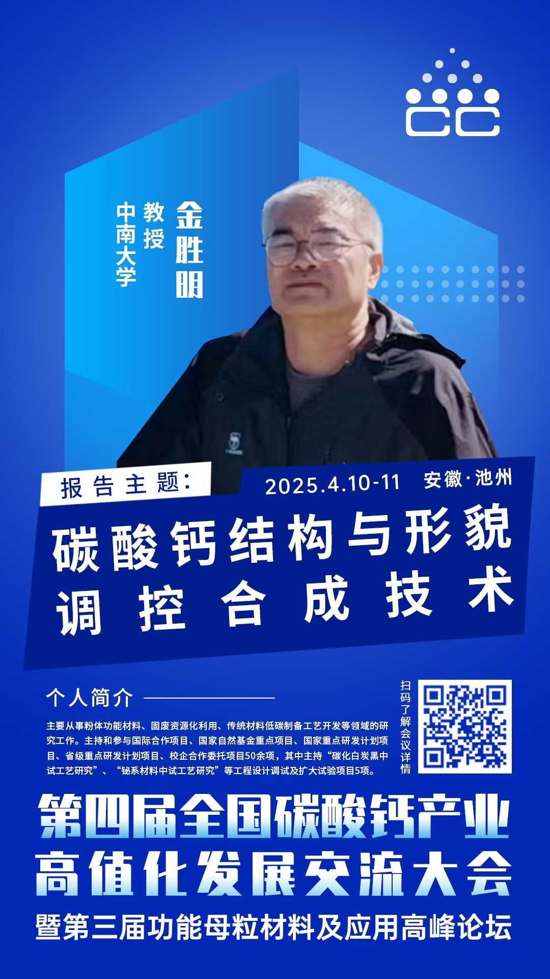 2025年4月10-11日,由中国粉体网主办的第四届全国碳酸钙产业高值化发展交流大会将在安徽·池州举行,届时中南大学金胜明教授将在大会上作《碳酸钙结构与形貌调控合成技术》主题报告,根据碳化法等主流工艺,分析不同形貌碳酸钙制备技术和应用优势,讲解工艺控制和晶型控制的要点。