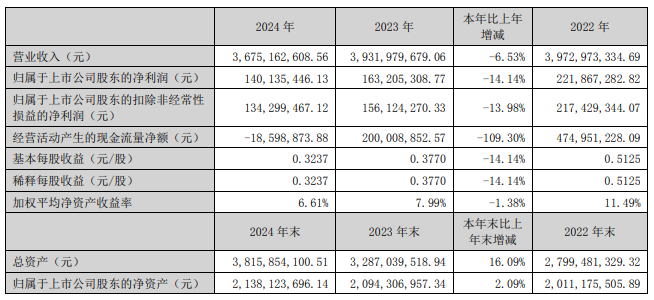 4月2日,金龙羽发布2024年年度报告,报告期内,公司实现营业收入36.75亿元,比上年同期减少6.53%;实现归母净利润1.4亿元,比上年同期减少14.14%。公司营业收入、净利润较去年同期下降的主要原因是工程建设放缓以及行业竞争加剧,同时公司设立新能源公司专门从事固态电池产业化,投入增加导致亏损扩大。