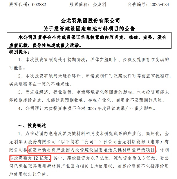 据悉,金龙羽计划总投资额为12亿元,其中,建设投资为8.7亿元,流动资金为3.3亿元。另外,孙公司已竞拍取得惠州新材料产业园内相关土地使用权,前述投资额不包括建设用地使用权出让价款。建设周期预计12个月,不超过三年。