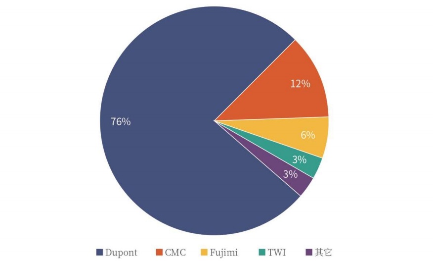 抛光耗材方面,目前国产化率仍较低,抛光液市场主要被CMC Materials、Resonac、Versum和Fujimi等美日企业垄断,抛光垫全球市场市场份额则主要被杜邦占据。