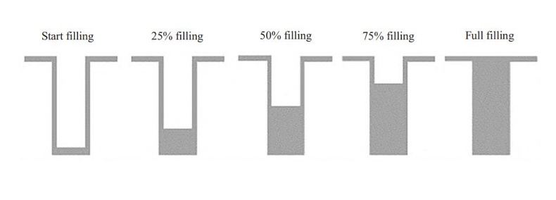 目前,对于TGV盲孔的主要填充方式是自上而下的填充。通过在TGV孔口侧壁及表面添加抑制剂,在盲孔底部添加加速剂的方式,抑制TGV孔口侧壁及表面铜沉积速度的同时,加速盲孔底部的铜沉积,从而让铜形成一种自下而上的填充方式来确保整个盲孔的填充过程中没有孔洞和缝隙的出现。