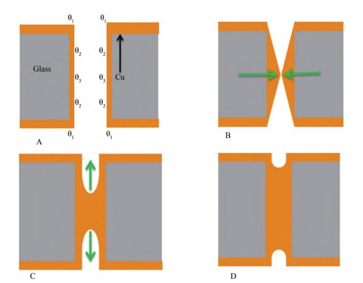 共形填充是通过添加剂的作用使得TGV孔内铜的沉积速率与孔的侧壁以及表面的沉积速率相当的一种电镀方式。对于垂直的盲孔与通孔,共形填充模式下随着填充过程的进行,其深宽比不断增大,在填充的最后阶段容易出现孔洞缺陷,而X形、V形通孔由于其自身特殊孔形的原因,从根本上避免了中央孔洞缺陷的形成,例如,X形通孔的中间区域较窄,在两侧铜等速沉积的情况下会先于通孔中央形成连接,然后逐步向上下两个方向进行类似自上而下的填充。相比于垂直通孔的蝶形填充电镀模式,共形填充的电镀模式由于加速剂的使用以及TGV孔形的原因,可以实现更大电流密度下通孔的完整快速填充。