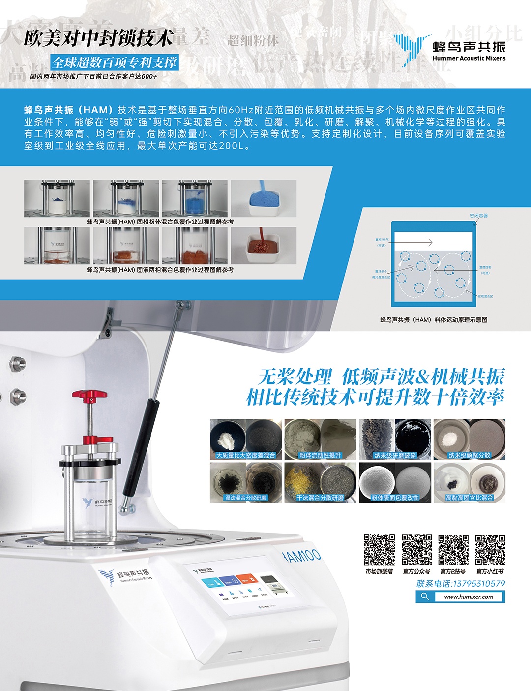 公司主打品牌“蜂鸟声共振”主攻集混合、分散、包覆、研磨、乳化等多种过程强化技术于一体的HAM系列声共振仪,可应用于增材制造、医药粉体制备、电子浆料、粉末冶金等多个行业领域!