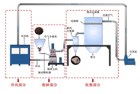 在整个粉碎过程中,冷风机产生冷风并通过引风机输送至粉碎腔内,使整个粉碎过程的温度保持在20℃以下,可以减少热敏物质的损失。此外,可以通过调节关键参数(分级机频率、粉碎主机频率、引风机频率)来改变低温冲击磨的粉碎效果。