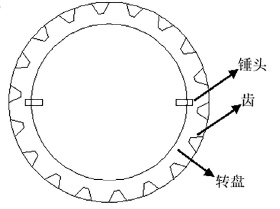 物料首先通过振动给料器进入冲击磨的粉碎腔内;在粉碎腔中,物料在高速旋转的转子的加速作用下撞击到衬板的齿上,或在转盘的锤头与衬板的齿面之间发生冲击剪切而粉碎;随后,粉碎的物料随着气流进入分级腔,分级腔内安装有一个垂直放置的分级轮转子,通过分级轮转子的旋转,产生一个旋转气流场,颗粒同时受到旋转的离心力和气流曳力两种作用力,粗颗粒所受离心力大于气流曳力,被抛向筒壁,沿筒壁落回粉碎腔继续进行粉碎,符合粒径要求的颗粒则随气流被吸入转子中心。分级部分的存在可以避免过度粉碎。绝大部分产物在旋风分离器的出口处收集,而非常小的颗粒则可能被筒式过滤器收集,从而避免粉尘污染。