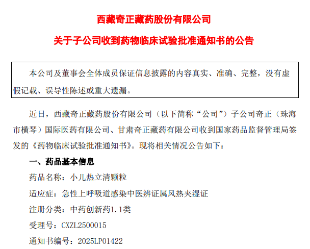 中国粉体网讯 5月28日,奇正藏药发布公告,公司子公司奇正(珠海市横琴)国际医药有限公司和甘肃奇正藏药有限公司收到国家药品监督管理局签发的《药物临床试验批准通知书》。该通知书涉及的药品为小儿热立清颗粒,适应症为急性上呼吸道感染中医辨证属风热夹湿证,注册分类为中药创新药1.1类。