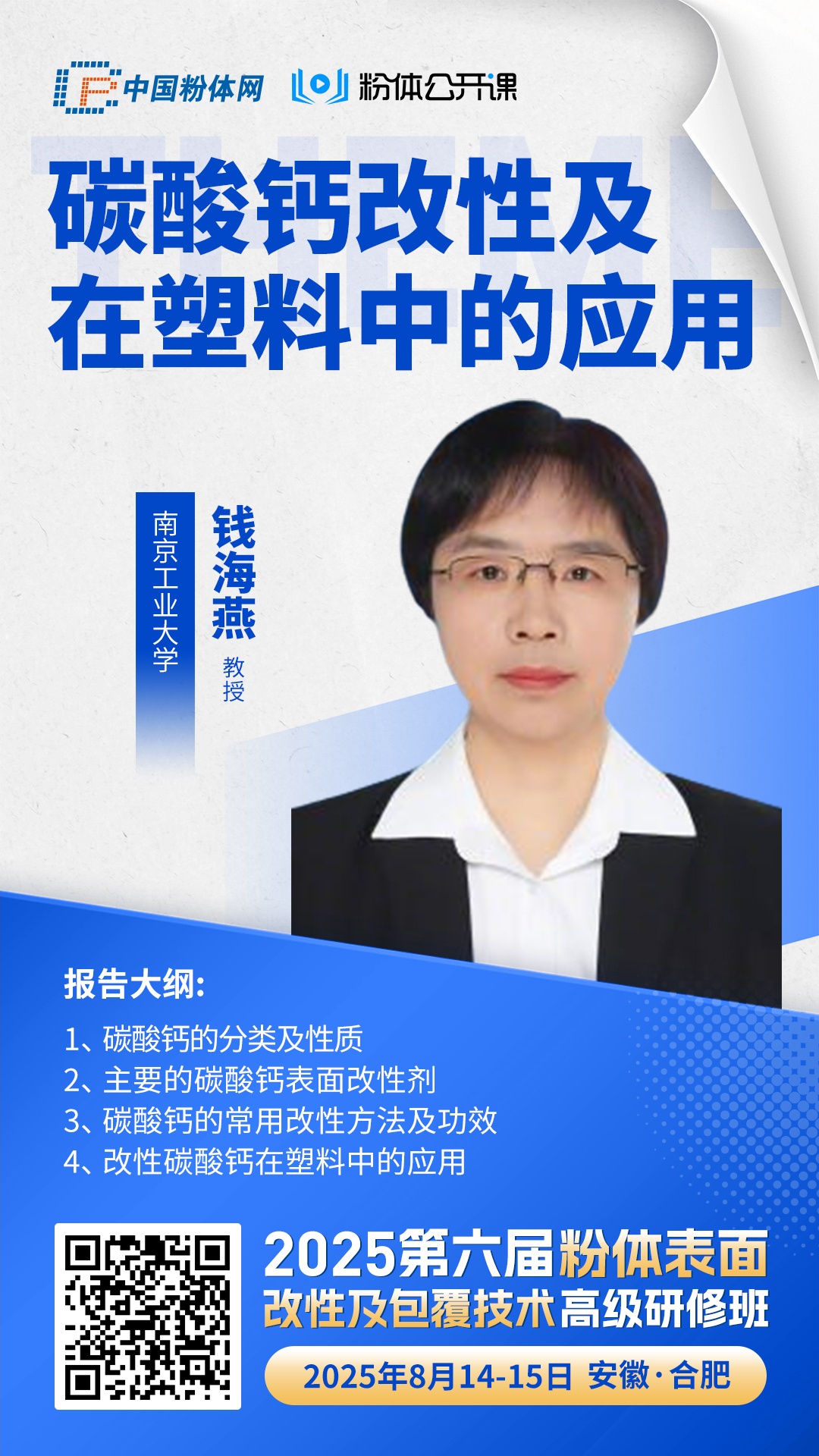 中国粉体网讯 为推动粉体表面改性及包覆技术发展,促进产学研交流合作,中国粉体网粉体公开课将于 2025 年 8 月 14 - 15 日举办 “2025 第六届粉体表面改性及包覆技术高级研修班”。本次研修班特邀南京工业大学钱海燕教授主讲《碳酸钙改性及在塑料中的应用》课程,为参会人员带来了无机粉体表面改性领域的最新研究成果。