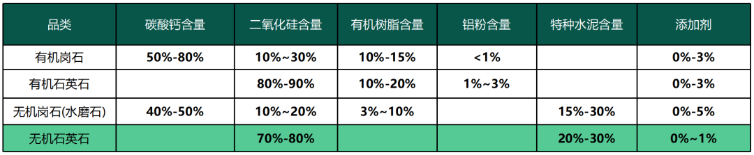 根据骨料类型,无机人造石可分为无机石英石和无机岗石。无机石英石主要是以SiO2为主,如石英、硅砂、花岗石等的石材碎料、粉体为骨料,无机岗石是以碳酸盐类,如石灰石、大理石等石材碎料、粉体为骨料。由于石英是一种非常坚硬的矿物,其莫氏硬度为7,因此,一般来说,无机石英石的强度、表面质量、耐久性都优于无机岗石。
