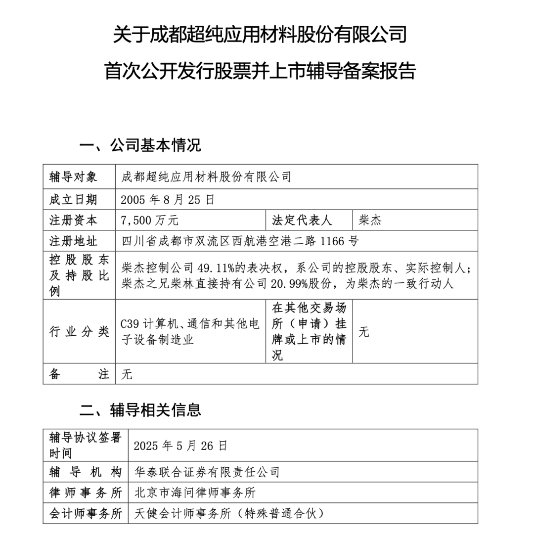 中国粉体网讯 近日,证监会官网披露了成都超纯应用材料股份有限公司(以下简称“成都超纯”)首次公开发行股票并上市辅导备案报告,成都超纯正式拉开A股IPO筹备工作的帷幕。