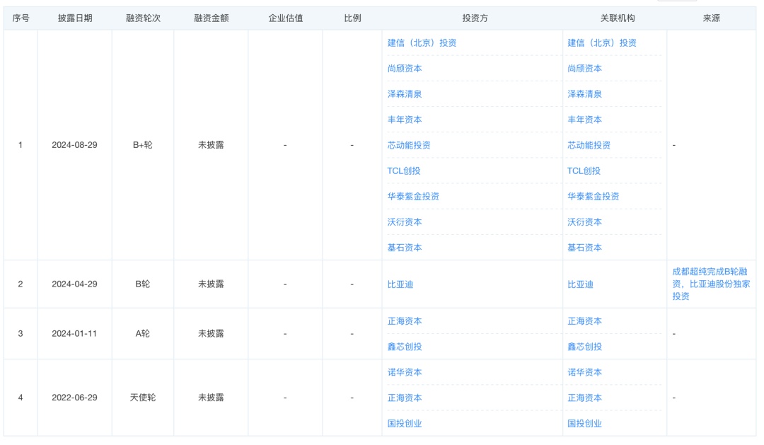 2024年,公司一年进行了A轮、B轮、B+轮三轮融资,正海资本、鑫芯创投、比亚迪、基石资本、沃衍资本、华泰紫金投资、TCL创投、芯动能投资、丰年资本、泽森清泉、尚颀资本、建信(北京)投资等投资方参与其中。其中,比亚迪独家投资了公司的B轮融资。