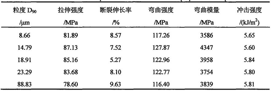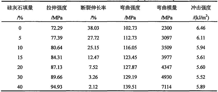 丛国龙等研究表明,填充PA66时,在硅灰石添加量40%以内,PA66的力学性能随着硅灰石添加量的增加逐渐升高;在8.6μm~23.3μm粒度范围内,PA66的拉伸强度、弯曲强度等随着粒度的增大先增加后下降,填充14.79μm的硅灰石时PA66的力学性能最佳。