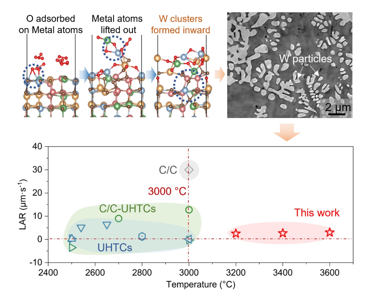 该材料的超高温抗氧化性能主要得益于生成的具有超高熔点的钨合金。相比其他元素,钨元素的表面氧原子吸附能最高,导致氧化难度最大,而除钨以外的其余元素则会优先氧化,并包裹于钨合金表面,进一步阻碍钨合金的氧化。在此原理基础上,钨合金弥散分布于氧化物层,可作为高熔点骨架,提高氧化物黏度,进而有效降低氧化物的高温挥发,阻碍氧气向内部基体渗透。