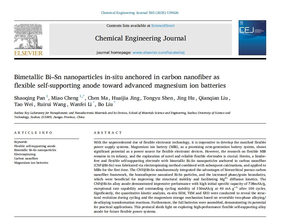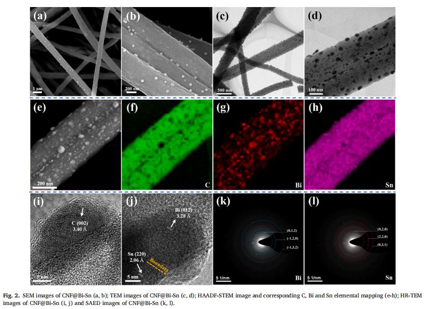 中国粉体网讯 近日,苏州科技大学刘波教授课题组通过静电纺丝法结合原位热还原工艺,制备了一种无粘结剂且柔性的自支撑电极,该电极由双金属Bi-Sn纳米颗粒锚定在碳纳米纤维(CNF@Bi-Sn)中构成,并首次应用于镁离子电池。