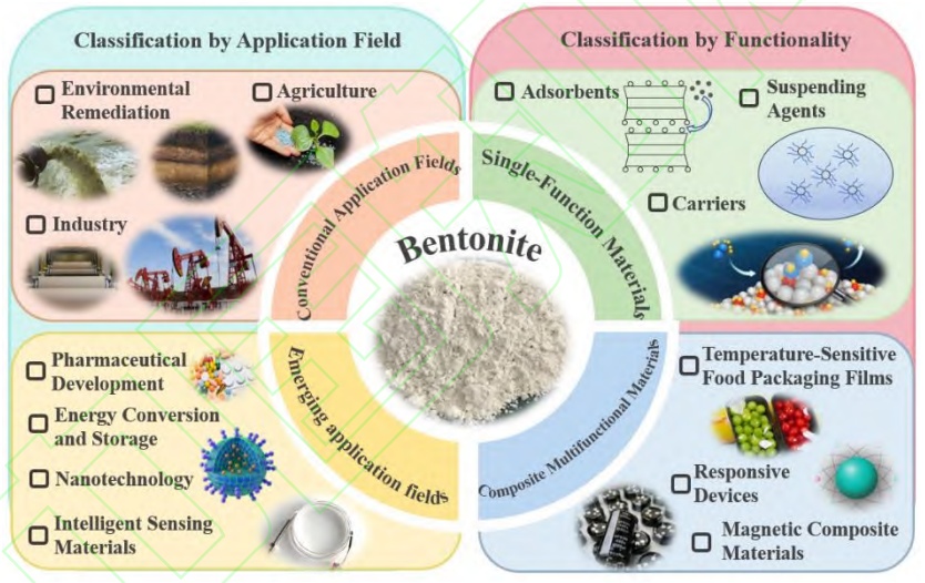 此外,改性膨润土在纳米复合材料、纳米传感器和纳米催化剂等领域展现出巨大的应用潜力;改性膨润土在智能材料和传感技术方面的应用也逐渐受到关注,如温度、湿度和生物感应材料等,在环境监测、健康诊断和安全保护等领域具有重要的应用价值。