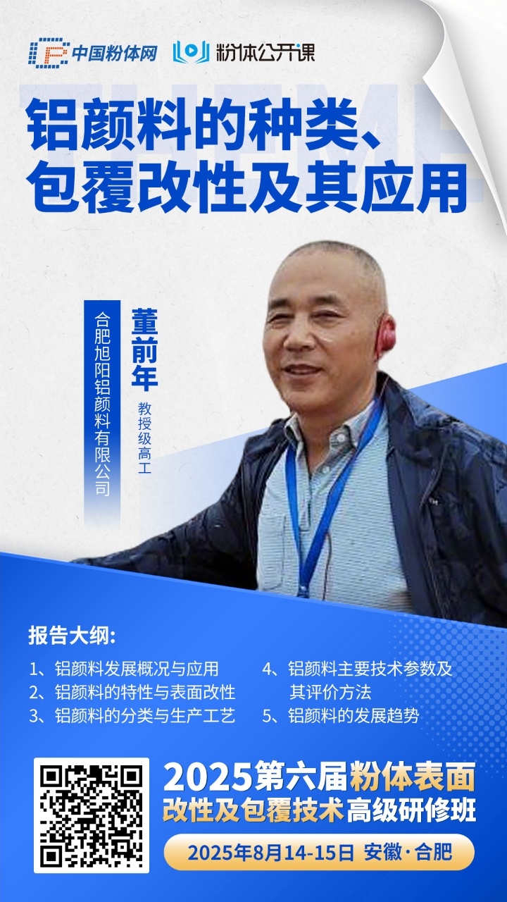 中国粉体网讯 为推动粉体表面改性及包覆技术发展,促进产学研交流合作,中国粉体网粉体公开课将于 2025 年 8 月 14 - 15 日举办 “2025 第六届粉体表面改性及包覆技术高级研修班”。本次研修班特邀合肥旭阳铝颜料有限公司董前年教授级高工主讲《铝颜料的种类、包覆改性及其应用》课程,为参会人员系统讲解铝颜料包覆改性。