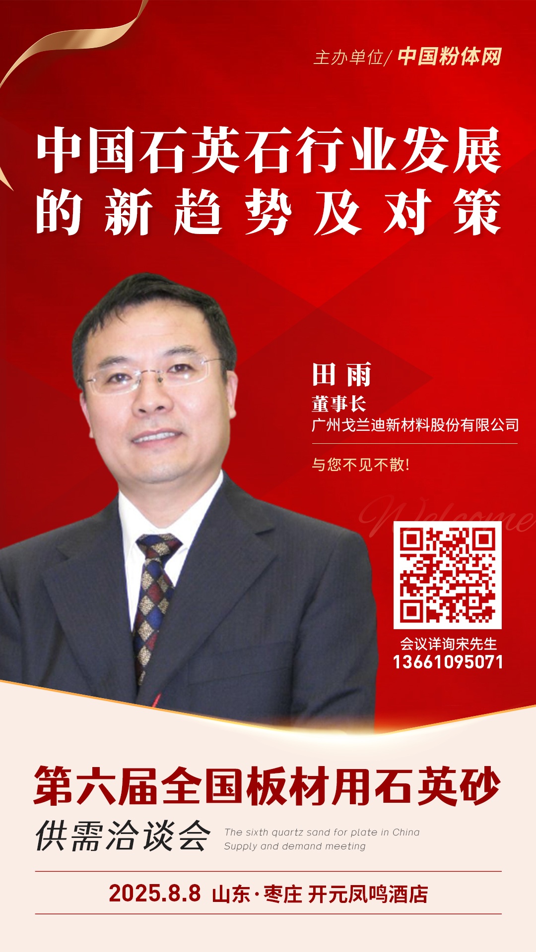 2025年8月8日,由中国粉体网主办的第六届全国板材用石英砂供需洽谈会将在山东枣庄召开,广州戈兰迪新材料股份有限公司董事长田雨将作《中国石英石行业发展的新趋势及对策》的报告,深度剖析行业当前面临的痛点难点,精准研判未来技术突破的核心方向,为行业发展拨开迷雾。