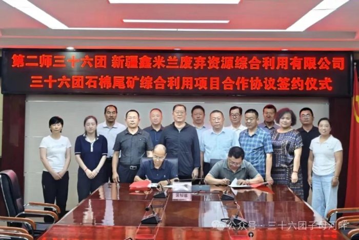 2025年6月18日,三十六团与新疆鑫米兰废弃资源综合利用有限公司举行了石棉尾矿综合利用项目签约仪式。此次签约的石棉尾矿综合利用项目计划总投资达12亿元,项目将分两期同步进行,第一期安装三条生产线;第二期在三十六团米兰产业园区内新建镁、铝冶炼项目。
