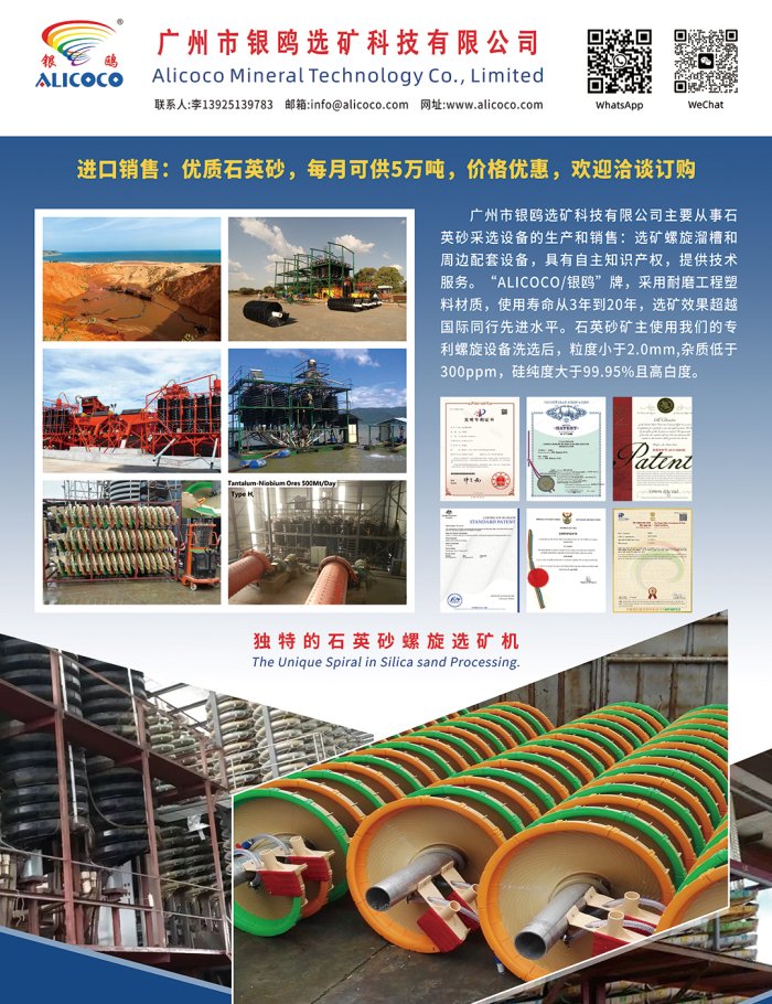 广州市银鸥选矿科技有限公司主要从事石英砂采选设备的生产和销售:选矿螺旋溜槽和周边配套设备,具有自主知识产权,提供技术服务。“ALICOCO/银鸥”牌,采用耐磨工程塑料材质,使用寿命从3年到20年,选矿效果超越国际同行先进水平。石英砂矿主使用我们的专利螺旋设备洗选后,粒度小于2.0mm,杂质低于300ppm,硅纯度大于99.95%且高白度。
