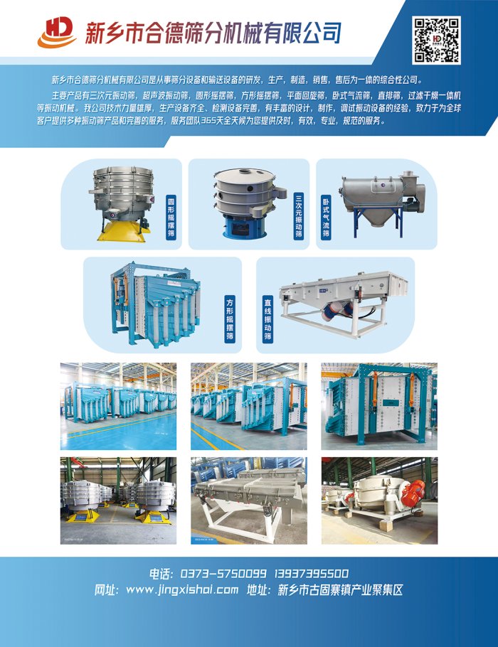 新乡市合德筛分机械有限公司是从事筛分设备和输送设备的研发,生产,制造,销售,售后为一体的综合性公司,主要产品有三次元振动筛,超声波振动筛,圆形摇摆筛,方形摇摆筛,平面回旋筛,卧式气流筛,直排筛,过滤干燥一体机等振动机械。我公司技术力量雄厚,生产设备齐全、检测设备完善,有丰富的设计,制作,调试振动设备的经验,致力于为全球客户提供多种振动筛产品和完善的服务,服务团队365天全天候为您提供及时,有效,专业,规范的服务。