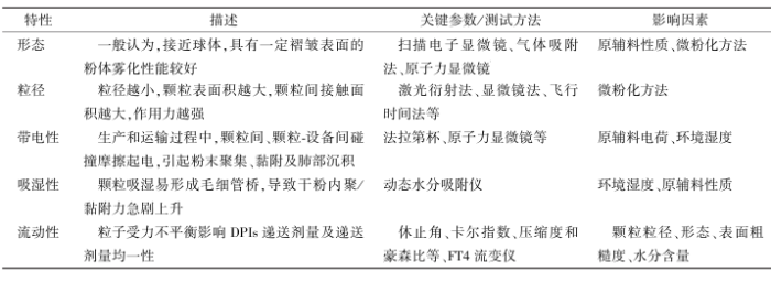 大多数DPIs由药物和辅料组成,其中原辅料表面粗糙引起的机械力、装置材料绝缘产生的静电力、水分存在时的毛细管力和来自物质电磁性质的范德华力综合作用影响药物与载体黏附-解聚的平衡。研发中药DPIs需特别关注处方流动性与黏附性的平衡问题。由于中药成分往往较为复杂,其粉体特性可能受更多因素影响,使得平衡这2种性质的挑战更为显著。DPIs的粉体特性,作为内聚力/黏附力综合作用的结果,其关键特性及相关测试方法、影响因素,见表。