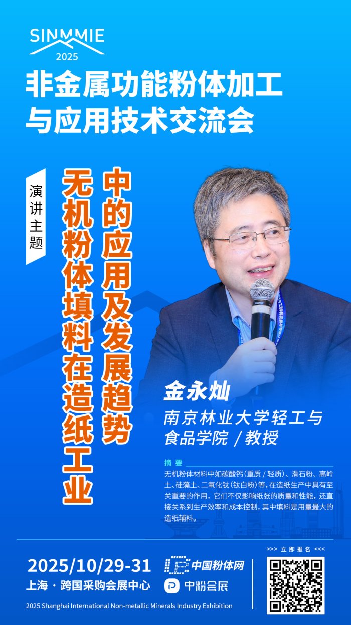 10月29-31日,北京粉体技术协会、柏德英思展览(上海)有限公司、山东中粉会展服务有限公司将在上海跨国采购会展中心联合主办“上海国际非金属矿工业展览会(SINMMIE2025)”,展会现场将同期举办“非金属功能粉体加工与应用技术交流会”,届时将邀请南京林业大学金永灿教授作《无机粉体填料在造纸工业中的应用及发展趋势》主题报告,分享碳酸钙、高岭土、滑石粉、硅灰石、钛白粉等粉体材料在造纸行业中的应用技术和研究成果。