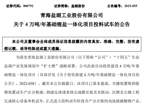中国粉体网讯 9月29日,盐湖股份发布公告称,公司此前启动投资建设4万吨/年基础锂盐一体化项目已基本建成,关键装置吸附提锂装置试车产出合格液,纳滤反渗透系统完成膜安装及水联动,沉锂及公辅工程完成核心设备单机试车,正式进入投料试车阶段并产出合格的电池级碳酸锂产品。