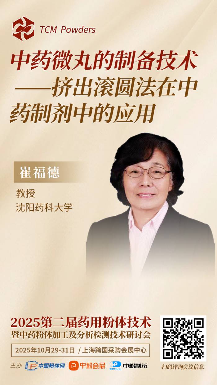 聚焦“从粉体技术、论中药工艺”为主题,10月29-31日,中国粉体网将于2025IPIE上海高端粉体装备与科学仪器展览会期间,同期举办“2025第二届药用粉体技术暨中药粉体加工及分析检测技术研讨会”,届时来自沈阳药科大学崔福德教授将为大家带来《中药微丸的制备技术-挤出滚圆法在中药制剂中的应用》的主题报告。报告主讲人将介绍挤出滚圆技术引入中药微丸制备,已获含提取物50~70%微丸、全草粉100%微丸及缓释包衣制剂;中药微丸成品体积、吸潮性与服药负担均显著降低,并易实现缓释。