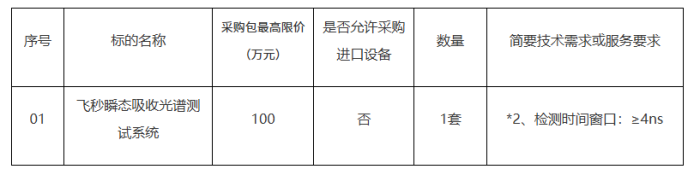 中国科学院长春应用化学研究所飞秒瞬态吸收光谱测试系统采购项目 招标项目的潜在投标人应在dfhzls@163.com获取招标文件,并于2025年11月06日 14点00分(北京时间)前递交投标文件。
