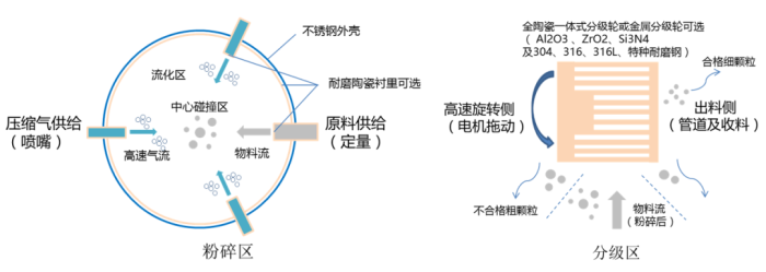 - 利用高压气流通过特定喷嘴后产生的高速气流加速物料,物料流对中撞击粉碎;