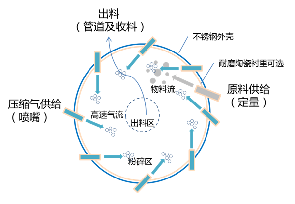 - 利用高压气流通过特定喷嘴后产生的高速气流加速物料,物料沿切线方向形成剪切涡流,在互相碰撞和与中圈的摩擦中被粉碎;