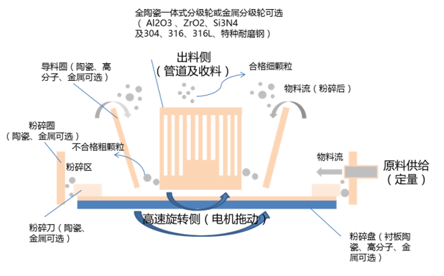 - 利用高速旋转的粉碎盘上的刀片带动形成高速冲击剪切涡流,物料在刀片和固定齿圈之间被粉碎;