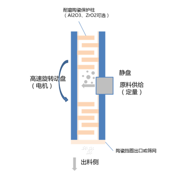 - 利用高速旋转的粉碎盘上的棒销带动形成高速冲击剪切涡流,物料在动盘和定盘之间被粉碎;