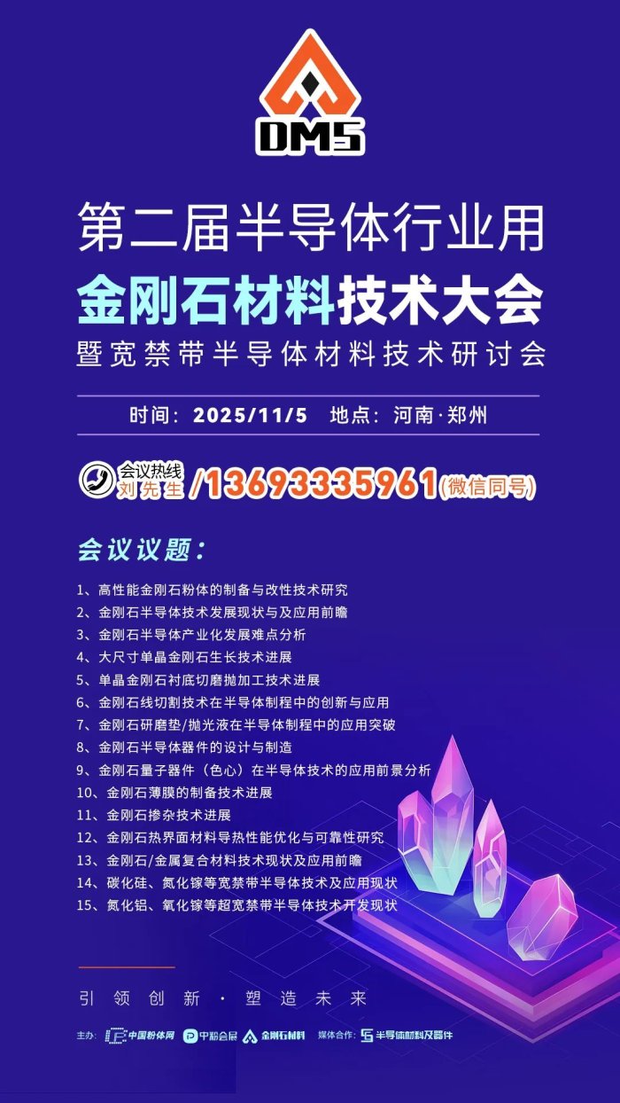 从2025半导体行业用金刚石材料技术大会组委会获悉,本届会议将于2025年11月5日在郑州举办。华为技术有限公司邀请您共同出席。